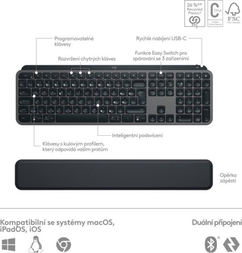 *Dobíjacie batérie Li-Po (1500 mAh) *Plné nabitie vydrží až 10 dní s preddefinovaným nastavením alebo až 5 mesiacov s vypnutým podsvietením *Pripojte sa pomocou technológie Bluetooth Low Energy alebo prijímača USB Logi Bolt *Ľahko prepínateľné klávesy pre pripojenie až troch zariadení a prepínanie medzi osvetlenie pre reguláciu jasu podsvietenia *Dobíjanie pomocou USB-C Úplné nabitie vystačí na 10 dní – alebo na 5 mesiacov s vypnutým podsvietením *Vypínač zap/vyp *Indikátory klávesy Caps Lock a batérie *Kompatibilný s myšami s funkciou Logitech Flow *Dosah bezdrôtového pripojenia 10 metrov