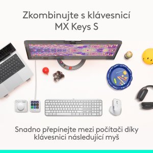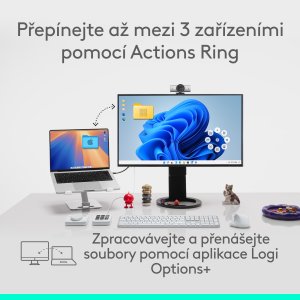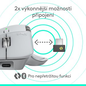 Myš podporuje pripojenie až k trom zariadeniam súčasne cez Bluetooth alebo Logi Bolt. Funkcia Logitech Flow umožňuje prenos súborov medzi rôznymi systémami. Nabíjanie cez USB-C je rýchle – minúta nabíjania stačí na 3 hodiny prevádzky.