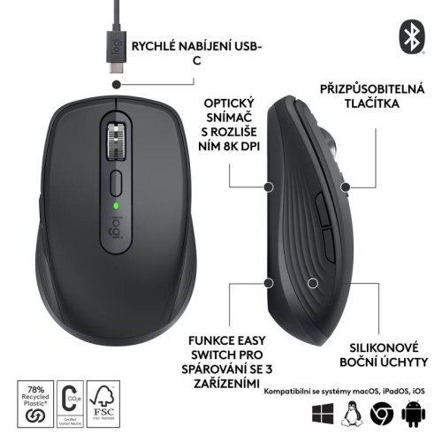 Pripojte sa až k 3 zariadeniam prostredníctvom Bluetooth v systémoch Windows, macOS, ChromeOS (U systémov iných ako Windows a macOS budú základné funkcie zariadenia podporované bez softvéru) alebo Linux (U systémov iných ako Windows a macOS budú základné funkcie zariadenia podporované bez softvéru). Kompatibilný iba s prijímačom Logi Bolt USB (prijímač nie je súčasťou dodávky).