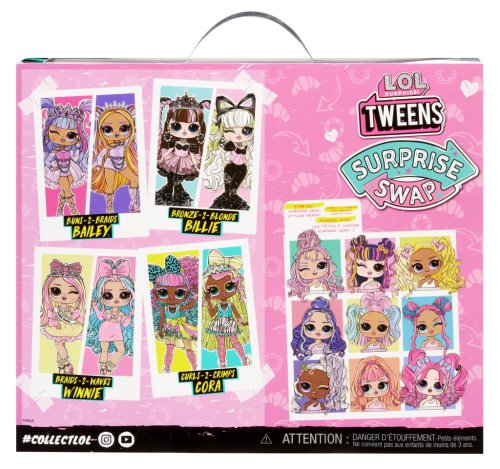 Obsah balenia:? • 1 zo 4 Swap Tweens bábik • mnoho prekvapení, vrátane rôznych módnych doplnkov • kefa na vlasy • stojan na bábiku