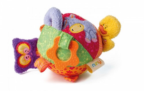 Plyšová Loptička "Niny" s aktivitami patrí do skupiny kolekcie Niny. Loptička ponúka deťom nespočetné množstvo herných variantov Je mäkkučká s pestrofarebnou kombináciou i-liatok s pvýšivkou zvieratiek. Jednotlivé doplnky, ktoré sú našité na loptičke buď šuštia, hrkajú. Loptička obsahuje plastové hryzátko. Na tréning jemnej motoriky tiež slúži gombík z dreva so šnúrkami. Možno zavesiť na kočík. Všetky použité materiály sú príjemné na dotyk a ponúkajú deťom ničím nerušený čas relaxácie. Dizajn nemeckej návrhárky Britty Hurter. Kolekcia NINY je zameraná predovšetkým na výrobky pre našich najmenších. Rozmer: 13cm (priemer) Vhodné pre deti: 0+