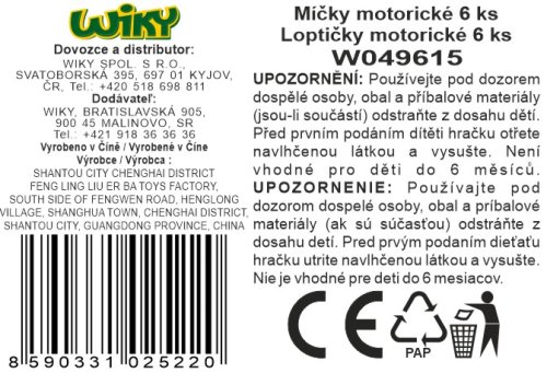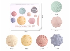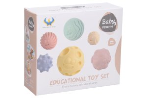 Loptičky motorické. Veľkosť 6cm. Obsahuje 6ks mäkkých loptičiek s rôznymi povrchmi. Pri stlačení píska.