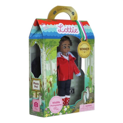 Od vtáčikov a motýľov až po všetky druhy divokej zveri je Mia milovníkom prírody. Kamkoľvek ide, nosia so sebou fotoaparát, pretože kto vie kedy alebo kde sa objaví tak skvelá fotografická príležitosť? Krásna fotka môže rozprávať svoj príbeh a môže povedať viac ako tisíc slov. Mia dúfa, že jej obrázky inšpirujú ďalšie deti k tomu, aby milovali divokú prírodu a rovnako ako ona sa o túto našu nádhernú planétu dobre starali! Nosí kochleárny implantát, ktorý je skôr súčasťou jej príbehu ako ústredným bodom. Je výsledkom spolupráce s britskou neziskovou organizáciou 'Toy Like Me', ktorá vedie kampaň za rozmanitosť v detských hračkách a za lepšiu reprezentáciu postihnutia, aby sa rôzne postihnuté deti mohli vidieť vo svojich hračkách, s ktorými sa deň čo deň hrajú. Ako ostatné bábiky z oceňovanej kolekcie Lottie je aj táto realistická a snaží sa deti naučiť úprimnému pohľadu na svet. Lottie sú navrhnuté a zvlášť prispôsobené malým detským rúčkam, majú pohyblivé kolená a sú vyrobené z prémiového mäkkého vinylu a nylonu, bez použitia ftalátov. Každá bábika je dodávaná v atraktívnej farebnej kartónovej taštičke s plastovým priehľadom a uchom. Hlavné vlastnosti: kĺbová bábika s pohyblivými kolenami, perfektné pre predstavivú hruprémiové nylonové vlasy sú hebké na dotyk a nezamotávajú sepanenka z vinylu bez obsahu ftalátov, mäkká na dotekpanenka má snímateľné topánky a stoja samostatne hnedé vlasy, hnedé očimilované všetkými deťmi, vhodné v zlatej edícii Balenie obsahuje: Mia, mladá fotografka divokej zveri, vybavená červenou bundou, tričkom s lienkou, modrou čiapkou, taškou, džínsami, červenými fľakatými čižmami a kochleárnym implantátomfotoaparát
