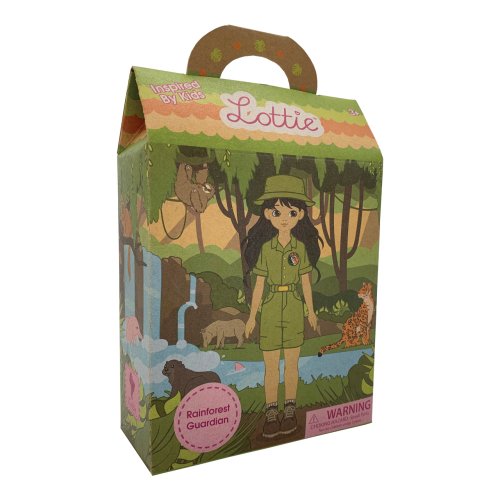 So svojim ďalekohľadom a lupou je pripravená skúmať a strážiť dažďový prales, ktorý je domovom mnohých ohrozených zvierat a rastlín. Príroda predsa poskytuje toľko dobrodružstiev, preto ju treba chrániť. V spolupráci s organizáciou Rainforest Trust prichádza kolekcia Lottie s bábikou, ktorá deti prostredníctvom sady kartičiek prevedie vzácnou Amazonskou prírodou. Ako ostatné bábiky z oceňovanej kolekcie Lottie je aj táto realistická a snaží sa deti naučiť úprimnému pohľadu na svet. Lottie sú navrhnuté a zvlášť prispôsobené malým detským rúčkam, majú pohyblivé kolená a sú vyrobené z prémiového mäkkého vinylu a nylonu, bez použitia ftalátov. Každá bábika je dodávaná v atraktívnej farebnej kartónovej taštičke s plastovým priehľadom a uchom. Hlavné vlastnosti: kĺbová bábika s pohyblivými kolenami, perfektná pre predstavivú hruprémiové nylonové vlasy sú hebké na dotyk a nezamotávajú sepanenka z vinylu bez obsahu ftalátov, mäkká na dotekpanenka má snímateľné topánky a stoja samostatne hnedé vlasy a hnedé očimilované všetkými deťmi, vhodné od 3 rokov bábika vo veľkosti 18 cm Balenie obsahuje: Lottie, milovníčky zvierat a strážkyne parku, vybavená zelenou kombinézou s opaskom, bielymi ponožkami, hnedými topánkami a klobúčikom ďalekohľad, lupa a 10 zberateľských kartičiek