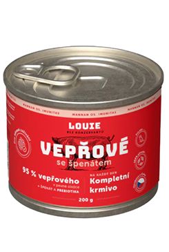 Kompletné krmivo bez obilnín pre psov každého veku i plemena, bravčové so špenátom. Ponúka Vášmu miláčikovi možnosť stravy z kvalitného mäsa (95% v pevnej zložke). Na podporu peristaltiky čriev a simuláciu minoritnej rastlinnej zložky v potrave psov slúži prímes špenátu a prebiotík. Krmivo neobsahuje žiadne konzervanty, dochucovadlá ani farbivá, iba 95% mäsa, špenát, prebiotiká, vitamíny a minerály.