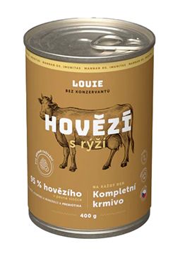 Kompletné krmivo bez obilnín pre psov každého veku i plemena, hovädzie s ryžou. Ponúka Vášmu miláčikovi možnosť stravy z kvalitného mäsa (95% v pevnej zložke). Na podporu peristaltiky čriev a simuláciu minoritnej rastlinnej zložky v potrave psov slúži prímes ryže. Krmivo neobsahuje žiadne konzervanty, dochucovadlá ani farbivá, iba 95% mäsa, 5% ryže, vitamínov a minerálov.