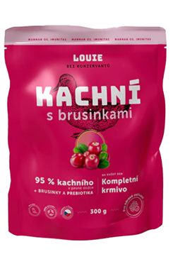 Praktické vrecko plné kompletného krmiva. Obsahuje 95% kačacieho mäsa v pevnej zložke a 5% rastlinnej zložky, vitamínov a minerálov. Pridané brusnice napomáhajú udržaniu zdravej močovej sústavy a podporujú peristaltiku čriev. A po Louie zostane len vylízaná miska.