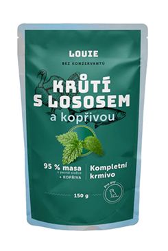 Kompletné krmivo bez obilnín pre psov každého veku i plemena, morčacie s lososom a žihľavou. Ponúka Vášmu miláčikovi možnosť stravy z kvalitného mäsa (95% v pevnej zložke). Na podporu peristaltiky čriev a simuláciu minoritnej rastlinnej zložky v potrave psov slúži prímes žihľavy. Krmivo neobsahuje žiadne konzervanty, dochucovadlá ani farbivá, iba 95% mäsa, žihľavy, vitamíny a minerály.