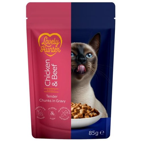 CHUŤ, KTORÚ MAČKY MILUJÚ Vlhké krmivo Lovely Hunter s kuracím a hovädzím mäsom je ideálnym každodenným riešením pre dospelé mačky – spája lahodnú chuť, kvalitné bielkoviny a dôležité živiny. KÚSKY V ŠŤAVNATEJ OMÁČKE Kuracie mäso poskytuje vysoko kvalitné bielkoviny potrebné na udržanie svalovej hmoty a energie, zatiaľ čo hovädzie prirodzene obohacuje krmivo o výraznú chuť a cenné minerály. Šťavnatá omáčka pomáha udržovať správnu hydratáciu organizmu, čo je zvlášť dôležité pre mačky, ktoré prirodzene menej pijú. DÔLEŽITÉ PRVKY PRE KAŽDODENNÉ ZDRAVIE Krmivo je doplnené taurínom – esenciálnou aminokyselinou nevyhnutnou pre správnu funkciu zraku, srdca a nervovej sústavy. L-karnitín podporuje zdravý energetický metabolizmus a udržanie optimálnej hmotnosti, zatiaľ čo DL-metionín napomáha správnej funkcii močového traktu. Vitamíny A, D3 a E spolu s minerálmi posilňujú imunitu, podporujú zdravie kostí a pomáhajú udržiavať prirodzenú rovnováhu organizmu. PRÍRODNÉ A BEZPEČNÉ Žiadny pridaný cukor ani umelé farbivá a dochucovadlá – len to, čo vaša mačka skutočne potrebuje na každodennú výživu. Vyrobené v Litve v súlade s vysokými štandardmi kvality a bezpečnosti. Kapsička Lovely Hunter – jednoduchá, každodenná výživa spájajúca chuť, starostlivosť a zodpovedný prístup. Zloženie: produkty zo suchozemských zvierat az nich získané produkty (vrátane 24 % kuracieho mäsa a 10 % hovädzieho mäsa), obilniny az nich získané produkty, hľuzy, korene az nich získané produkty, ostatné rastliny, riasy, huby az nich získané produkty, olejnaté semená, olejnaté plody az nich získané produkty. Doplnkové látky na 1 kg: nutričné doplnkové látky: vitamín D 3 (3a671) 300 MJ, vitamín E (3a700) 100 mg, monohydrát síranu železnatého (3b103) 2 mg, bezvodý jodičnan vápenatý (3b202) 0, (3b405) 2 mg, monohydrát síranu manganatého (3b503) 2 mg, oxid zinočnatý (3b603) 10 mg, taurín (3a370) 1 000 mg, L-karnitín (3a910) 50 mg, technicky čistý DL6-methión. Analytické zložky: hrubý proteín 8,6 %, hrubá vláknina 1,2 %, hrubý tuk 3,5 %, hrubý popol 2 %, vlhkosť 82 %, vápnik 0,2 %, fosfor 0,16 %. Kŕmny návod: Pre najlepšiu chuť podávajte pri izbovej teplote. Mačke vždy zaistite čerstvú pitnú vodu. Dávkovanie: