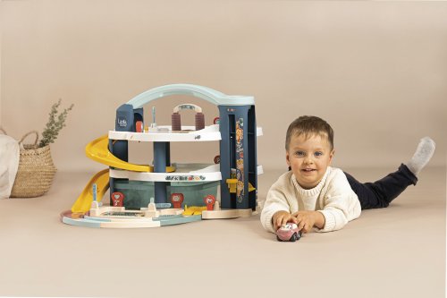 Veľká poschodová parkovacia garáž Little Smoby. Na 3 podlažiach je čo objavovať. Mini autíčka pohodlne cestujú výťahom, schádzajú cez široké trate alebo tajnou cestou, ktorú je možné ľahko otvoriť pákou. Súčasťou je umývačka, servisná dielňa so zdvíhacou plošinou, benzínová pumpa a úložný box. Súprava obsahuje mini autíčko a mini vrtuľník. Veľké viacpodlažné parkovisko je vyrobené v osvedčenej Smoby kvalite zo zdravotne nezávadných materiálov. Rozmery (DxŠxV): 62 x 60 x 43 cm.