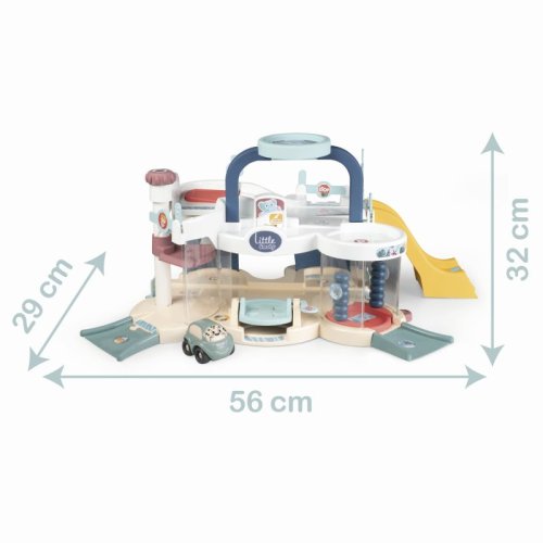 Multigaráž Little Smoby má veľký otočný nákladný výťah, parkovisko a veľké rampy na splavovanie. Skoková rampa poskytuje potrebnú hybnosť pre rýchlejšiu jazdu. Pohyblivé zábrany ukazujú, kde je prejazd zakázaný, pretože rampa môže byť inštalovaná na dvoch rôznych miestach. Nad parkovacou plochou je helipad, kde štartuje a pristáva vrtuľník. V spodnej časti multigaráže s dielňou a umývačkou je o autíčka dobre postarané. Široké nájazdové rampy a zábrany zaisťujú regulovaný proces. Súprava obsahuje jedno mini autíčko. Rozmery produktu (DxŠxV): 56 x 29 x 32 cm.