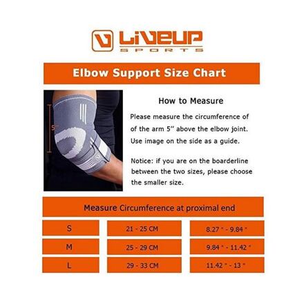 Elastická bandáž lakťa LiveUp LS5673 poskytuje rovnomernú podporu lakťa a blízkeho predlaktia pri všetkej fyzickej záťaži. Elastická bandáž na lakeť LiveUp LS5673 je priedušná, veľmi pohodlná, nebráni v pohybe, nezhŕňa sa a je vhodná na nosenie po celý deň. Bandáž LiveUp LS5673 veľkostne zodpovedá obvodu lakťa 20,3-31,1 cm (SM) alebo 31,1-40 cm (L-XL) a je možné ju použiť na obe ruky. Zloženie: 35% polyester, 35% nylon, 30% guma. VEĽKOSTNÁ TABUĽKA NA FOTKE