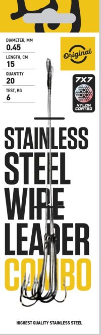 Oceľové lanká Stainless steel wire leader combo Oceľové lanká Stainless steel wire leader combo sú spoľahlivé oceľové lanká určené na lov šťúk. Mäkká oceľová väzba zo siedmich drôtov je z vonkajšej strany potiahnutá syntetickou niťou so špeciálnou impregnáciou. Lanká sú vybavené kvalitným obratlíkom (pre pripojenie kmeňového vlasca) a obratlíkom so sponou (pre uchytenie nástrahy). Použitie dvoch stavcov výrazne minimalizuje krútenie vlasca, čo ocení každý rybár.