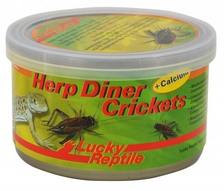Konzervovaní cvrčky. Špecialitou konzervovaných krmív od Lucky Reptile je fakt, že do väčšiny je pridávaný sépiový prášok ako zdroj vápnika. To platí aj o konzervovaných cvrčkoch zo série krmív Herp Diner. Títo cvrčky potom majú optimálny pomer vápnika a fosforu, sú teda úplne vhodným krmivom pre väčšinu plazov.
