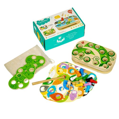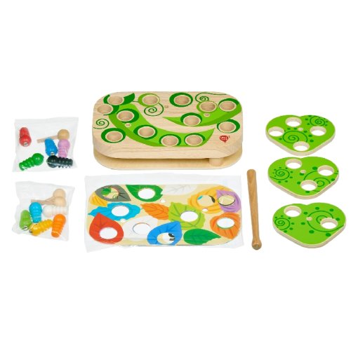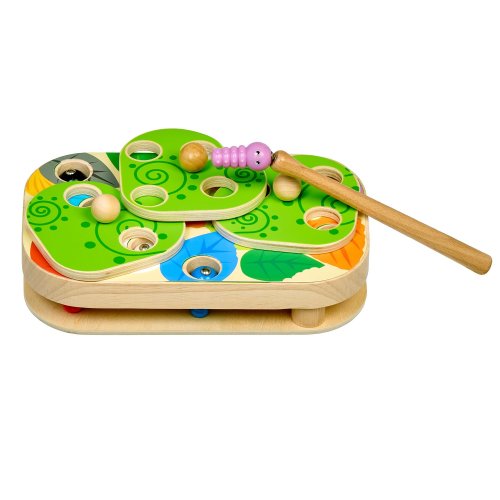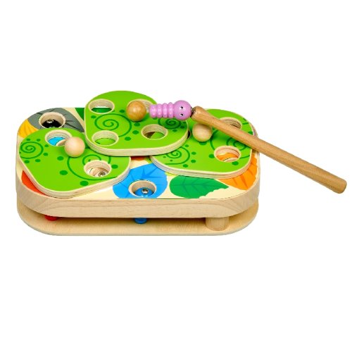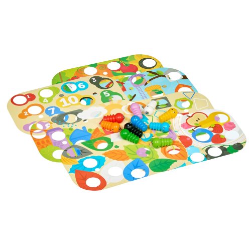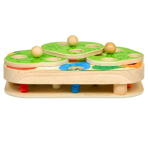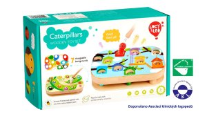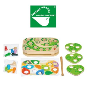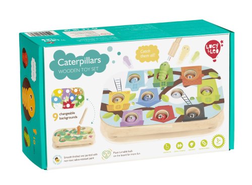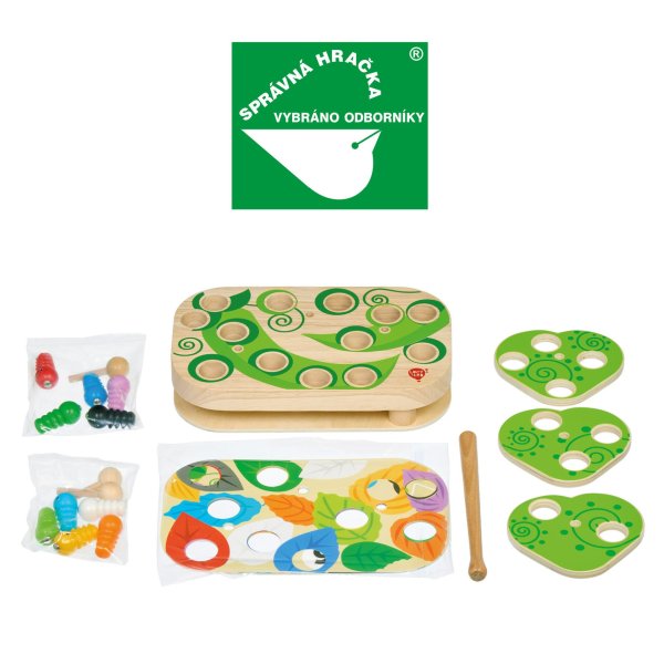 Chytanie húsenice je drevená motorická stolová hra s magnetmi, ktorá sa skladá zo základnej drevenej dosky, 7 farebných vymeniteľných predlôh, 10 farebných húseníc s magnetom, magické paličky s magnetom, 3 otáčavých listov, 3 kolíkov na upevnenie listov a ľanového vreca. Šibalské húsenice začali hrať na schovávačku! Nájdite a chyťte ich spoločne s deťmi pomocou kúzelnej paličky s magnetom. Spôsobov, ako pochytať húsenice je veľa. Pre menšie deti priložte na základnú dosku jednu z farebných predlôh, vložte húsenice do otvorov napríklad podľa farieb a lov kúzelnou magnetickou paličkou môže začať. Vymieňaním predlôh môžu deti húsenice loviť napríklad z farebných listov, domčekov alebo aj podľa čísel. Starším deťom sťažíte chytanie húseníc tým, že na predlohu pridáte otáčavé listy, ktoré zafixujete kolíkom tak, aby sa mohli po predlohe rotačným spôsobom pohybovať a tým lovenie sťažíte. Táto hra je veľmi užitočná pre rozvoj logického myslenia, kreativity, obratnosti a detskej motoriky. Súčasťou výrobku je ľanové vrecúško, do ktorého si menšie časti hry pekne uložíte.