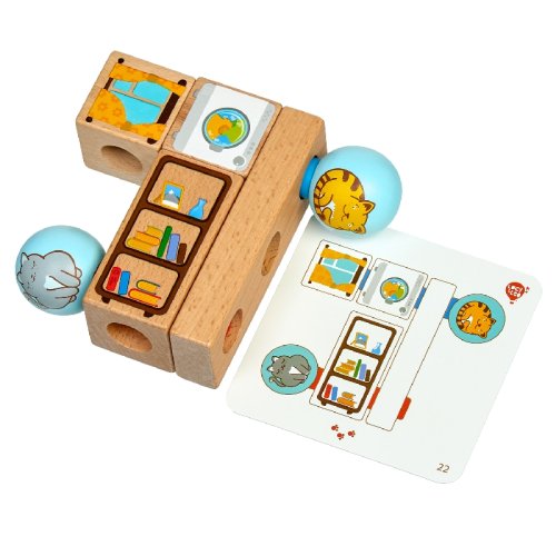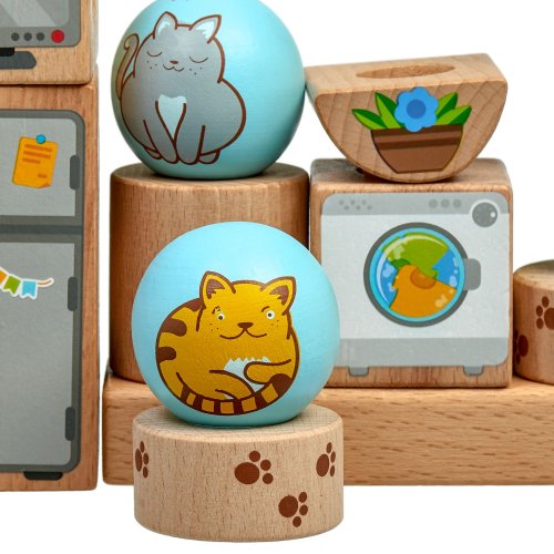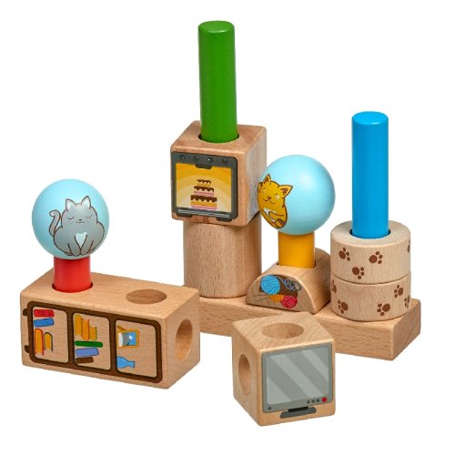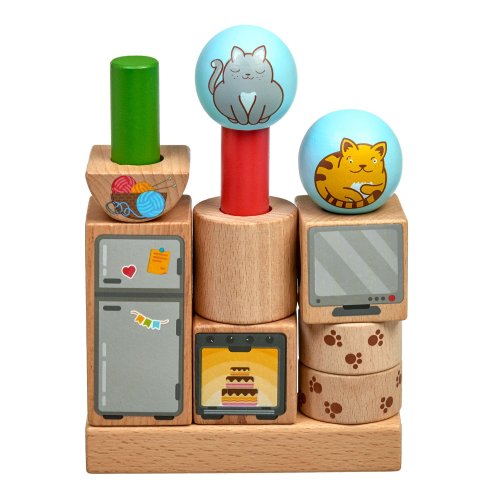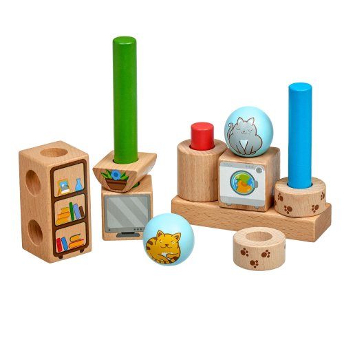 Hravé mačky je drevená skladačka s rôznymi geometrickými tvarmi. Súčasťou je základňa s okrúhlymi kolíkmi, rôzne geometrické farebné tvary s motívom mačičiek a nábytku a 24 predlôh. Cieľom hry je vyskúšať rôzne usporiadania a umiestniť všetky tvary na kolíky podľa predlôh. Po skončení hry je možné skladačku umiestniť do ľanového vrecka. Skladačka je skvelá pre rozvoj logického myslenia, jemnej motoriky a detskej predstavivosti. Rozmer základne 14 x 2,5 x 4,5 cm. Dĺžky kolíkov sú: 8 cm 14 cm, 18 cm a priemer 2 cm. Geometrické tvary majú rôznorodé rozmery. Rozmer kariet 12 cm x 12 cm.