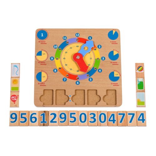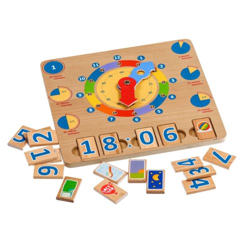 Drevenú náučnú hraciu dosku s hodinami je možné využiť na učenie času a hodín. Doska obsahuje obrázky rôznych časových intervalov a veľké farebné hodinové ručičky s jasnými časovými segmentmi. Ďalej ju tvorí 14 blokov s číslami a 6 blokov s obrázkami denných činností. Štyri časové bloky je možné vložiť do zdierok tak, aby predstavovali digitálne hodiny, a piaty blok predstavuje akciu, ktorá je prítomná v dennom režime dieťaťa v stanovenú dobu. Týmto hravým spôsobom sa deti rýchlo naučia obyčajným pohľadom rozoznávať a určovať čas a hodiny. Rozmer dosky 24 x 24 x 1cm, rozmer blokov 4 x 2,5 cm