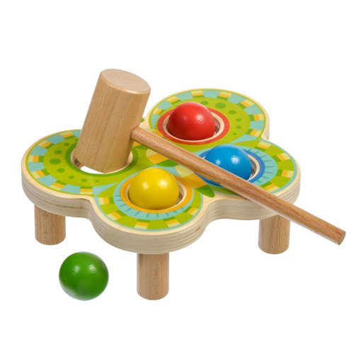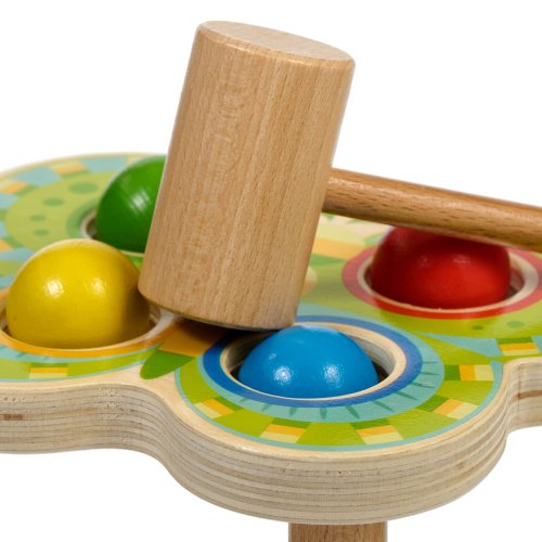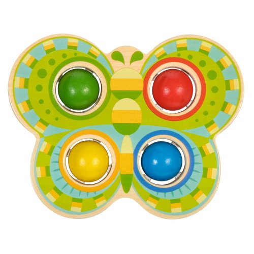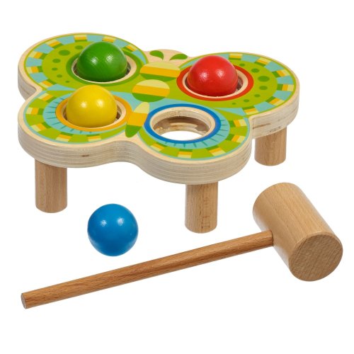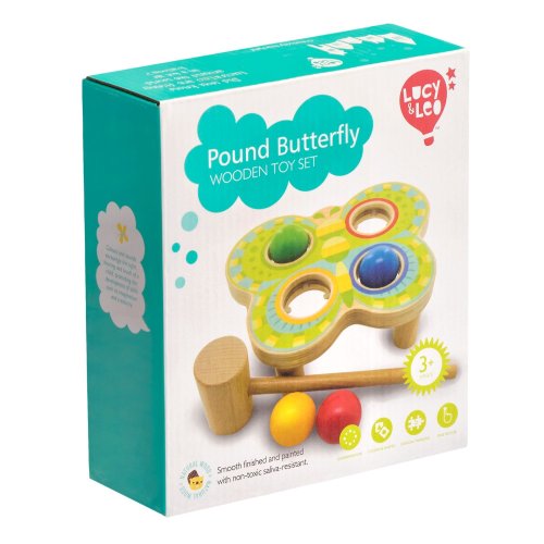 Motýľ je dizajnovo netradičná drevená zatĺkačka v tvare krásneho farebného motýľa so 4 farbenými guľami, ktorá zdobí jeho krídla. Je to zábavná hra, pri ktorej deti kladivkom udrie do farebných gulí a tie následne prepadnú do otvorov zodpovedajúcej farby. Hračka slúži na rozvoj jemnej motoriky, koncentrácie a koordináciu pohybu. Šírka krídiel motýľa 21 cm, dĺžka 20 cm, výška 5 cm. Rozmery kladivka 19 x 6 cm, priemer gule 3,5 cm.