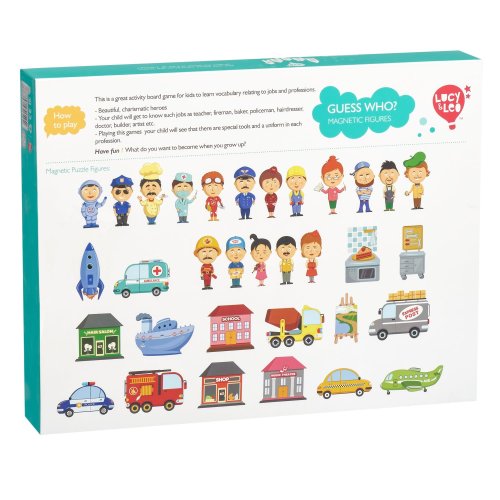 Uhádneš moje povolanie? je magnetická hra pre deti so skvelou príležitosťou dozvedieť sa o rôznych zamestnaniach a profesiách. V praktickom drevenom kufríku s obojstranným hracím vekom sa skrýva 17 rôznych dvojdielnych postavičiek, ktoré sú zástupcami najrôznejších povolaní. Pre niektoré profesie je charakteristická uniforma a dopravné prostriedky, ktoré na svoju činnosť potrebujú. Iné profesie majú zase typické miesto, v ktorom sa tá činnosť vykonáva, alebo sú pre nich charakteristické určité pomôcky. V kufríku sa tiež nachádza 17 obojstranných kartičiek, ktoré sú identické s magnetickými dielmi. Cieľom hry je všetko správne skombinovať. Súčasťou balenia je aj mazacia hubka a čierny fix, ktorým je možné maľovať na bielu časť tabule a 5 farebných kried pre maľovanie na čiernu tabuľu. Táto edukatívna vývojová hra rozvíja u detí chápanie, znalosti, predstavivosť, jemnú motoriku, abstraktné a priestorové myslenie. Pri práci s kartami, podľa ktorých môžu deti buď skladať jednotlivé obrázky alebo maľovať, rozvíja senzorické zručnosti, umelecký vkus alebo aj fantáziu. Menšie deti tu môžu trénovať aj veľmi dobre farby. Po skončení hry je možné všetko pohodlne uložiť do praktického kufríka, ktorý z tejto hračky robí ideálnu hru aj na cesty.