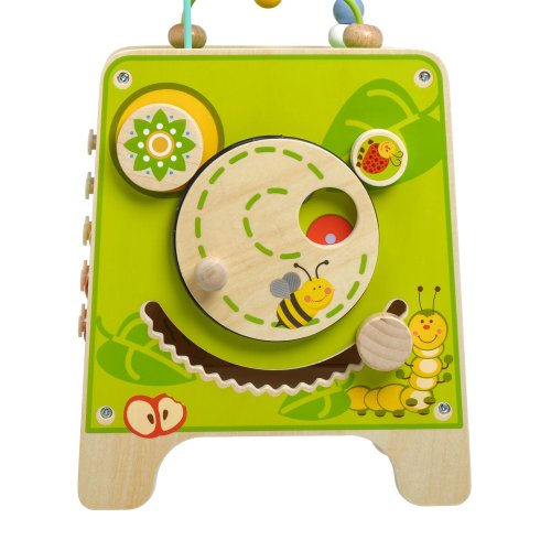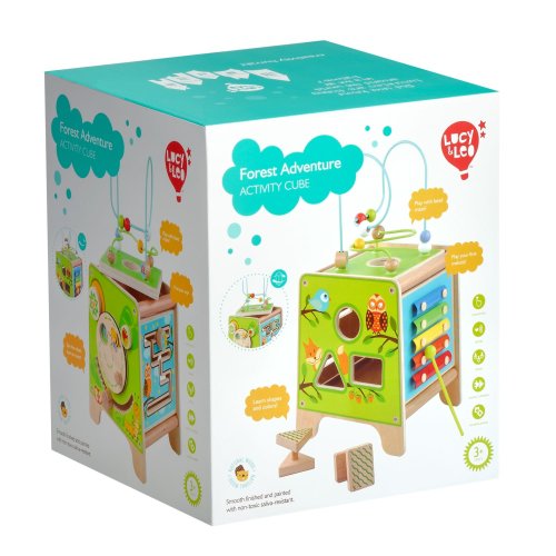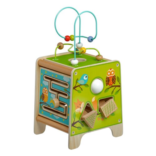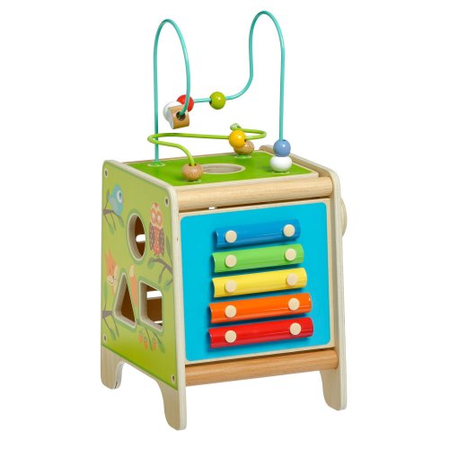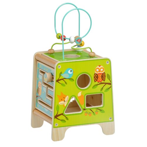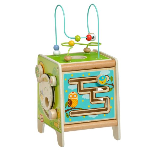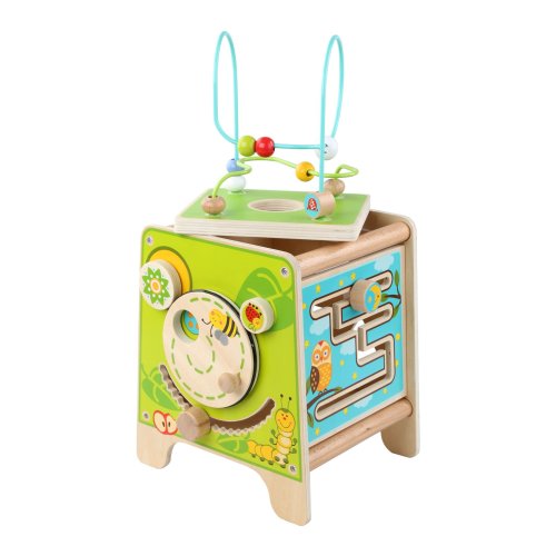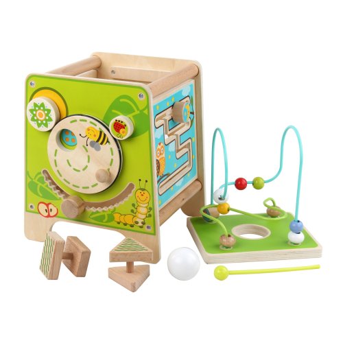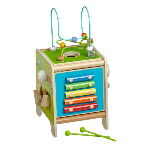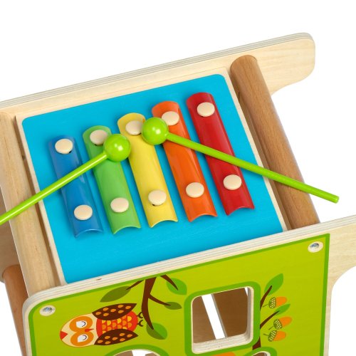 Drevená motorická kocka 5v1 s xylofónom kombinuje niekoľko vzdelávacích a zábavných prvkov naraz. Hore nájdete korálkový labyrint s dvoma zakrivenými koľajnicami, ktorý sa dá vybrať a otočiť smerom do kocky tak, aby bol úplne uschovaný. Na ostatných stranách je xylofón s paličkami, vkladačka dvojdielnych rotačných geometrických tvarov, drevený motorický labyrint, rotujúce koliesko, otočné prvky a zábavná hra s presúvaním kolíčka v drážke. Všetky strany sú zdobené krásnymi farebnými obrázkami a zábavnými postavičkami zvieratiek, ktoré udržujú pozornosť dieťaťa, podporujú fantáziu a senzomotorické schopnosti. Dĺžka kocky 20 cm, výška 26 cm. Výška labyrintu 18 cm. Dĺžka paličiek 15 cm. Veľkosť geometrických tvarov cca 5,5 cm.
