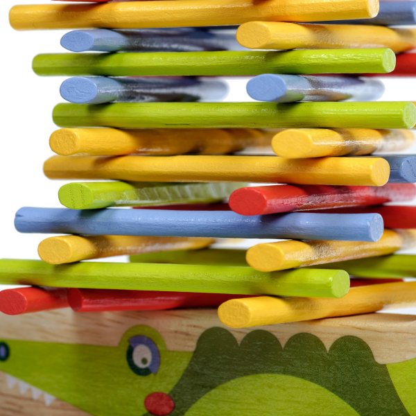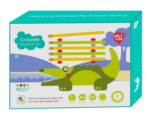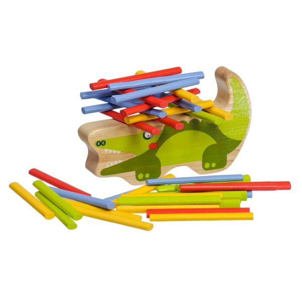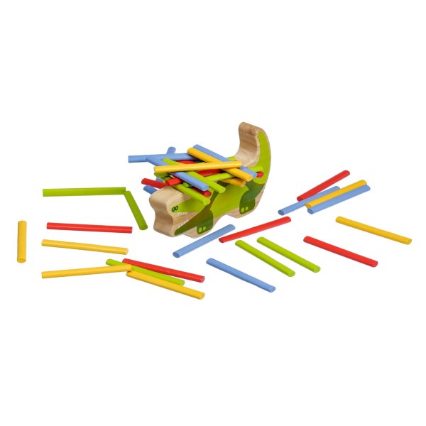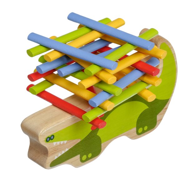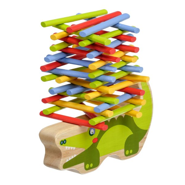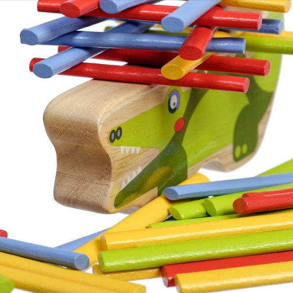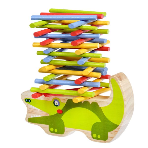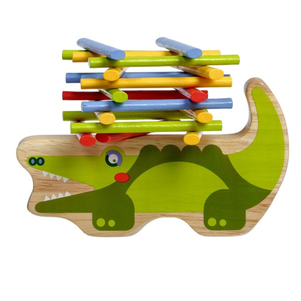 Krokodíl je drevená balančná hra, ktorá sa skladá zo základne v podobe krokodíla a 40 farebných tyčiniek v štyroch základných farbách. Cieľom hry je umiestniť všetky farebné tyčinky v štýle hry „Jenga“ na hornú stranu krokodíla tak, aby bola veža vyvážená a nespadla. Je to skvelý spôsob, ako u detí zábavným spôsobom trénovať trpezlivosť, podporovať jemnú motoriku, naučiť ich starostlivému plánovaniu a celkovo vyskúšať ich schopnosti v jednoduchej a zábavnej výzve. Súčasťou balenia je uzatvárateľné bavlnené vrecko, do ktorého si sadu pekne uložíte a je možné ju vziať kamkoľvek so sebou. Rozmer bavlneného vrecka 17 x 23 cm. Dĺžka krokodíla 14 cm, výška 8 cm, šírka 2 cm. Dĺžka tyčiniek 7,5 cm.