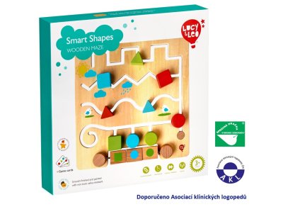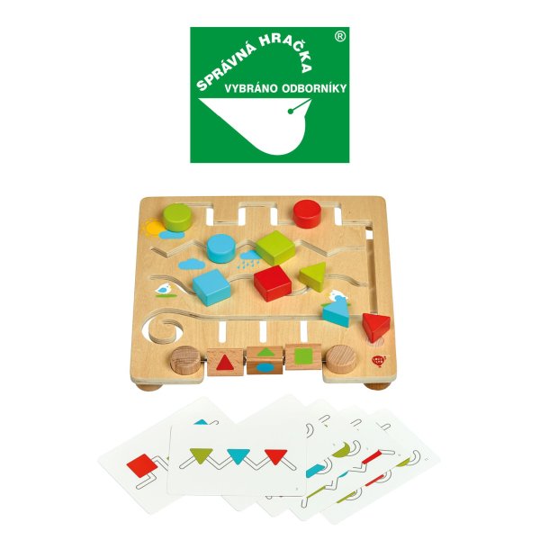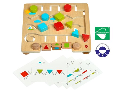 Geometrické tvary s predlohami je drevené bludisko, ktoré deťom pomáha rozvíjať logické myslenie a senzomotorické schopnosti. Drevená herná doska s hladkým povrchom má množstvo rôznych kľukatých cestičiek s farebnými drevenými tvarmi. Deti sa snažia daný tvar posúvať po cestičke tak, aby sa zhodoval s tvarom na jednom z troch rotujúcich blokov umiestnených v spodnej časti hracej dosky, alebo pracujú s 12 papierovými predlohami (6 obojstranných kariet), ktoré ponúkajú ďalšie úlohy. Hra je ideálna aj na cesty. Rozmer hracej dosky 30 x 30 x 5 cm. Táto hračka je označovaná ako Montessori pomôcka.