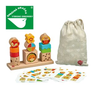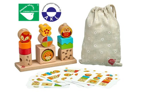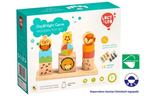 Deň a noc je drevená skladačka s predlohami zvieratiek a geometrických tvarov. Na kartách s označením slnka sú vidieť aj ich farby, zatiaľ čo na kartách s označením mesiaca a hviezd sú vidieť už len predovšetkým ich tvary. Hra obsahuje drevenú základňu s tromi okrúhlymi kolíkmi, 3 kocky s lesnými zvieratkami, ktoré sú vyobrazené cez deň na jednej strane a počas noci na druhej strane a plno ďalších kociek rôznych farieb, tvarov a veľkostí. Súčasťou je aj 14 obojstranných predlohových kariet. Cieľom hry je vyskúšať rôzne usporiadania a umiestniť všetky kocky na kolíky podľa predlôh. Po skončení hry je možné skladačku umiestniť do ľanového vrecka, ktoré je súčasťou balenia. Skladačka je skvelá pre rozvoj logického myslenia, jemnej motoriky a detskej predstavivosti. Táto hračka je označovaná ako Montessori pomôcka.