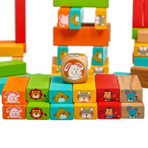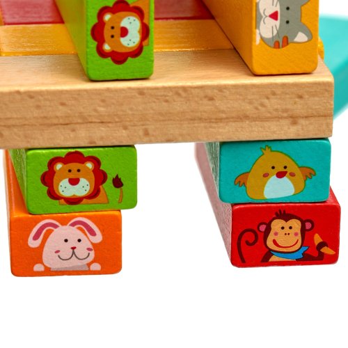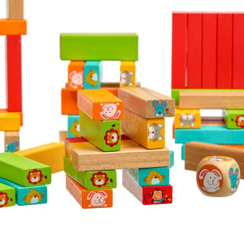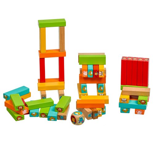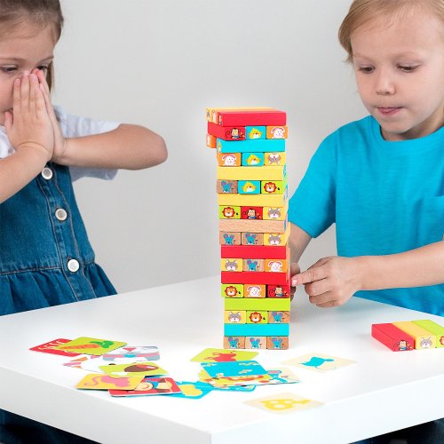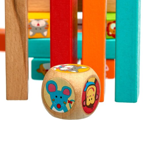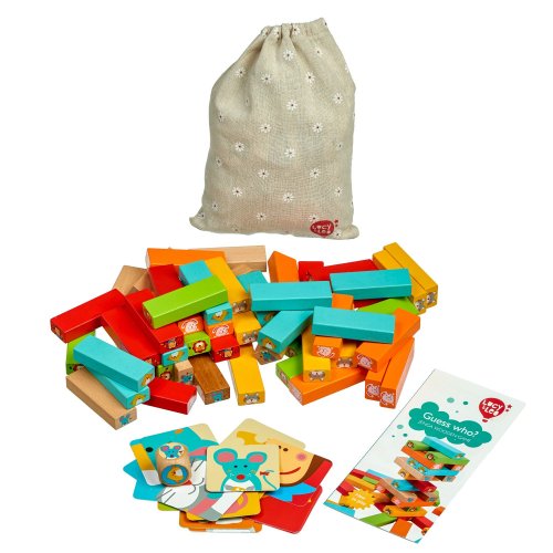 „Hádaj, kto“ je detská drevená hra Jenga. Hladké drevené bloky s obrázkami zvieratiek sú najprv naskladané do vysokej veže a cieľom hry je odobrať ich tak, aby veža nespadla. Na každom bloku je iné zviera a hráči sa striedajú vo výbere zvieraťa a odstránení zodpovedajúceho bloku z kôpky. Zvieratká na blokoch sa vyberajú buď pomocou hodu na priloženej kocke, alebo špeciálnych kartách, kde deti budú musieť uhádnuť zviera, aby mohli vybrať potrebný blok. Hra obsahuje množstvo pravidiel, vďaka ktorým bude hra zábavná pre niekoľko hráčov. Kocky je možné navyše použiť ako stavebnicu, alebo dokonca ako základ pre inú hru, pokiaľ si vymyslíte vlastné pravidlá. Aj obrázkové kartičky je možné využiť na rôzne iné hry, napríklad ako pexexo. Hra zábavným spôsobom podporuje jemnú detskú motoriku, logické myslenie, predstavivosť, ale aj trpezlivosť. Hra obsahuje 54 drevených farebných blokov, na ktorých sú vyobrazené zvieratká, 24 farebných kariet s rôznym vyobrazením zvieratiek alebo len ich častí, 1 hraciu kocku so zvieratkami, ľanové vrecúško a pravidlá. Rozmery blokov 7,5 x 2,5 x 1,5 cm.