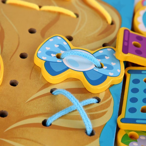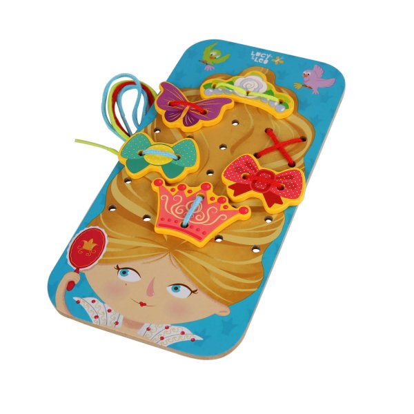 Princezná je drevený šnurovací a prevliekací set s 31 drevenými dielmi a 4 šnúrkami. Obsahuje jednu veľkú podložku, na ktorej je vyobrazená hlava roztomilej princeznej s vysoko vyčesanými vlasmi do krásneho účesu, ktorý treba ešte dozdobiť mnohými farebnými doplnkami. Tie sa upevnia do vlasov pomocou šnurovania. Princezná sa totiž chystá na bál, a preto potrebuje pomoc s prípravami. Hra rozvíja u detí jemnú motoriku, kreativitu, estetické cítenie, ale podporuje aj znalosť farieb a rozlišovanie tvarov. Rozmer dosky s princeznou 13 cm x 27 cm - 1 ks. Rozmer ozdôb 6 cm x 6 cm - 30ks. Dĺžka šnúrok 30 cm - 4ks rôznej farby. Táto hračka je označovaná ako Montessori pomôcka.