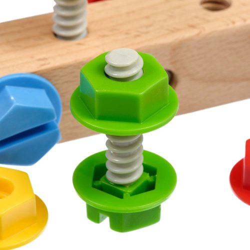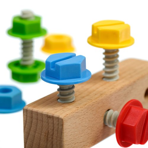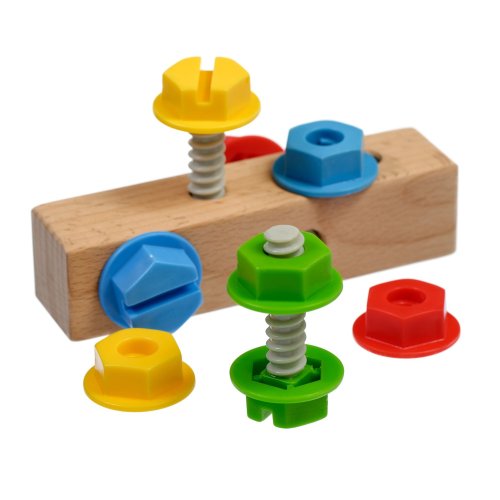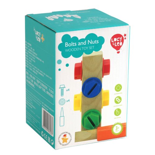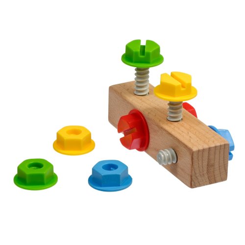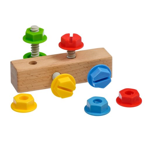 Skrutky a matice je hrací set predovšetkým pre malé budúce techniky. Hra rozvíja u detí jemnú motoriku, logické myslenie, trpezlivosť a podporuje znalosť farieb. Deti sa snažia plastové skrutky a matice buď svojimi prstami alebo priloženým skrutkovačom zaskrutkovať do dreveného bloku. Hra obsahuje jeden drevený hranol so 4 závitmi, 4 plastové skrutky s maticami v rôznych farbách a jeden drevený skrutkovač. Táto hračka je označovaná ako Montessori pomôcka.