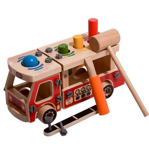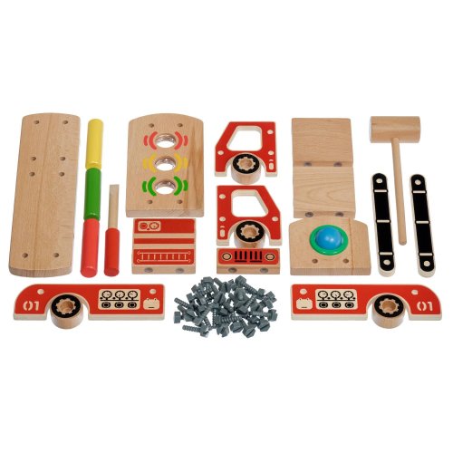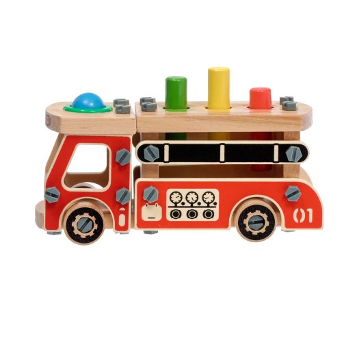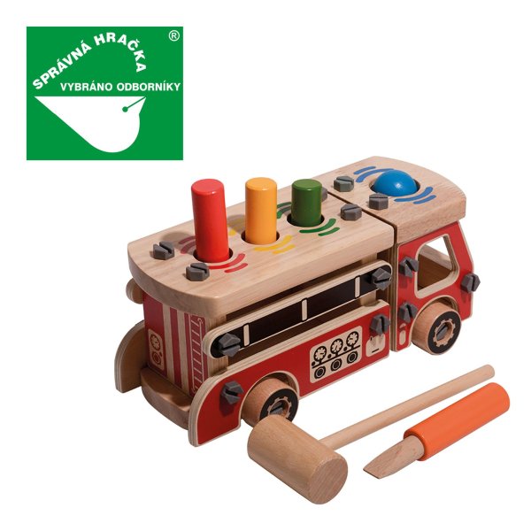 Drevená konštrukčná sada Hasiči zaujme predovšetkým chlapcov. Sada obsahuje množstvo drevených dielov, skrutiek a náradia na montáž, plus kladivko a 4 zatĺkacie drevené prvky. Po zostavení a zoskrutkovaní všetkých drevených dielov získa malý staviteľ krásne hasičské auto, ktorá má na streche korby a návesu navyše štyri otvory určené na zatĺkanie jednotlivých zatĺkacích prvkov. Okrem jemnej motoriky sa dieťa pri hre s touto hračkou naučí rozlišovať tvary a farby, trénovať pamäť, pozornosť a trpezlivosť. Balenie obsahuje 17 drevených dielov na zostavenie auta, veľa skrutiek, 1 skrutkovač, 3 farebné kolíky a 1 guľu na zatĺkanie a kladivko. Táto hračka je označovaná ako Montessori pomôcka.