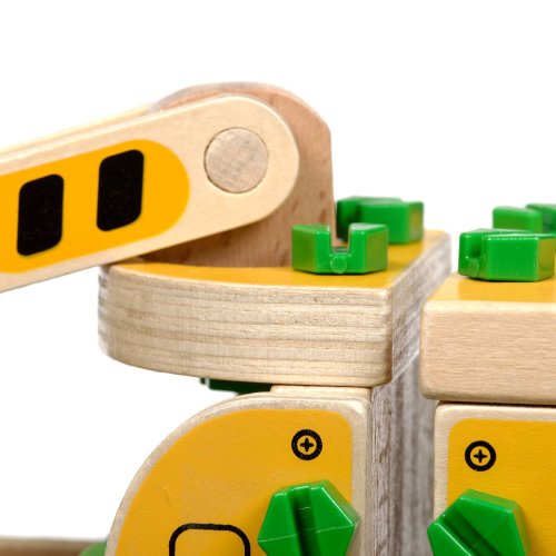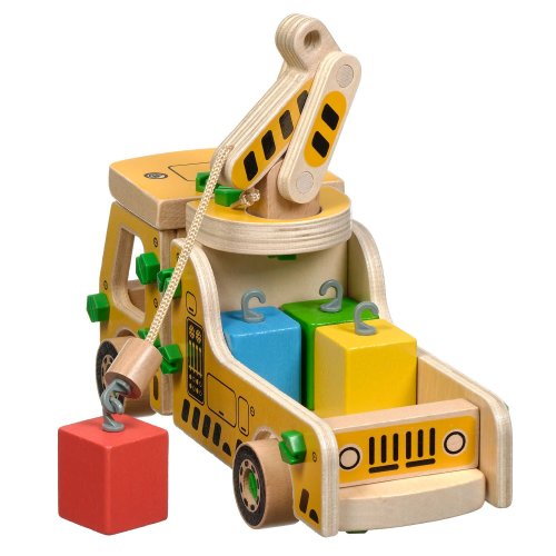 Drevená konštrukčná sada Autožeriav zaujme predovšetkým chlapcov. Súprava obsahuje množstvo drevených dielov, skrutiek a náradia na montáž, plus drevené kocky predstavujúce náklad. Po zostavení a zoskrutkovaní všetkých drevených dielov získa malý staviteľ krásny autožeriav. Priložené samostatné kocky rôznych farieb predstavujúce náklad majú na vrchnej strane háčiky, vďaka ktorým ich hák na autožeriave môže zdvihnúť a premiestňovať. Okrem jemnej motoriky sa dieťa pri hre s touto hračkou naučí rozlišovať tvary a farby, trénovať pamäť, pozornosť a trpezlivosť. Balenie obsahuje 16 drevených dielov na zostavenie auta, veľa skrutiek, 1 skrutkovač, 4 farebné kocky ako náklad. Táto hračka je označovaná ako Montessori pomôcka.