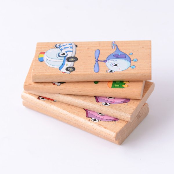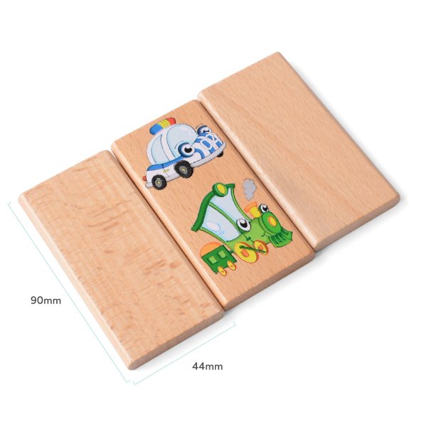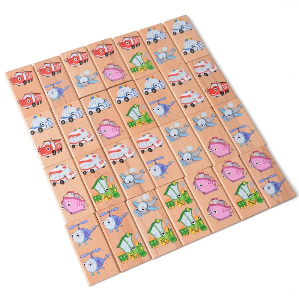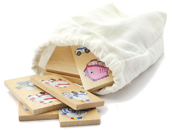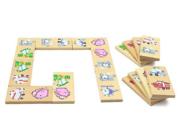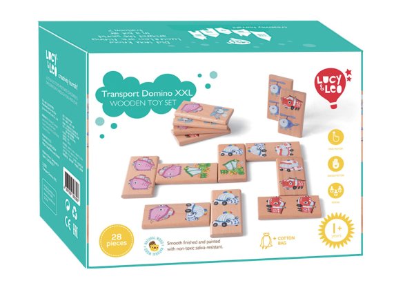 Domino XXL s motívom dopravných prostriedkov obsahuje 28 drevených veľkých dielikov, na ktorých sú znázornené veselým spôsobom hasiči, sanitka, policajné vozidlo, mašinka, parník, vrtuľník a lietadlo. Okrem klasickej hry, kedy sa k sebe prikladajú kartičky tou stranou, na ktorej je rovnaký motív, tak deti môžu nájsť a pomenovať aj zástupcov jednotlivých skupín dopravných prostriedkov a niečo si aj o nich povedať.