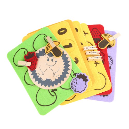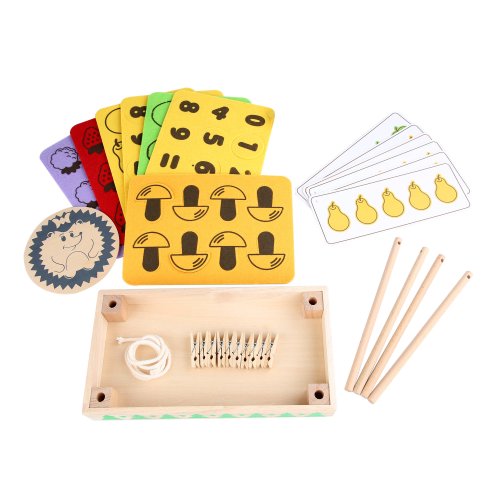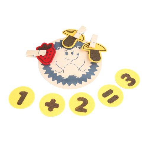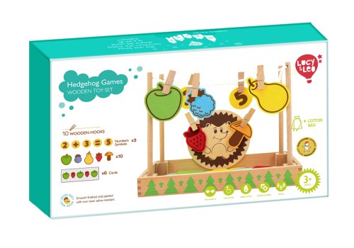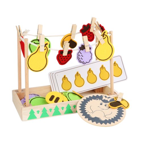 Vzdelávacia hra "Ježko" je ďalšou hrou patriacou do skupiny Montessori hračiek. Deti milujú, keď môžu mäkké, na dotyk príjemné ovocie alebo zeleninu „sušiť“ pomocou malých kolíčkov a učiť sa nové veci. Táto hra ponúka deťom nevšedný spôsob poznávania ovocia a zeleniny a neskôr im zábavným a hravým spôsobom pomáha predstaviť si počiatočné pojmy matematiky. Pripravuje deti na stretnutie s číslicami a aritmetickými znamienkami. Navyše silne podporuje zmyslové vnímanie vďaka interakcii s prvkami z rôznych materiálov, ako je drevo, plsť a lano. Podporovaná je veľmi aj jemná motorika. Rôzne detaily zaujmú deti na dlhú dobu, rozvíja u nich vytrvalosť a pozornosť. Bohaté balenie obsahuje drevenú základňu so 4 stĺpikmi, medzi ktorými je zavesené malé lanko, 10 drevených kolíčkov, dreveného jažečka na zadávanie úloh, 6 obojstranných kariet s predlohami, perforované farebné podložky z plsti s ovocím a zeleninou plus podložky s číslicami a matematickými znamienkami. Po ukončení hry je možné jednotlivé drobné diely bezpečne uložiť do priloženého bavlneného vrecúška. Rozmery zloženej hernej sady: 30 x 16 x 22 cm, priemer ježka 14 cm. Rozmery kartičiek: 22,5 x 8,5 cm. Rozmery ovocia a zeleniny cca 6-9 x 5-7 cm.