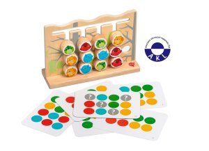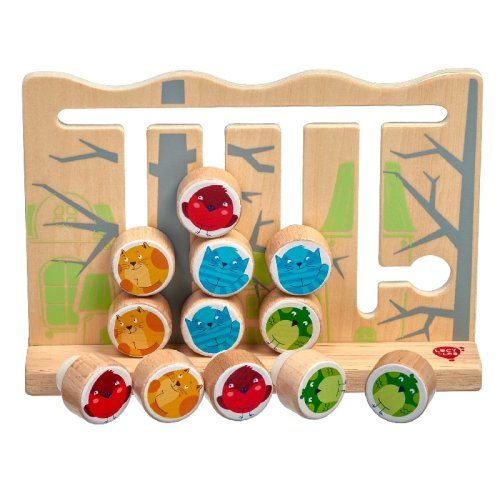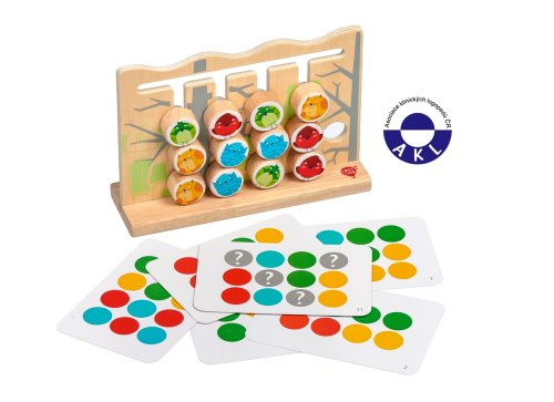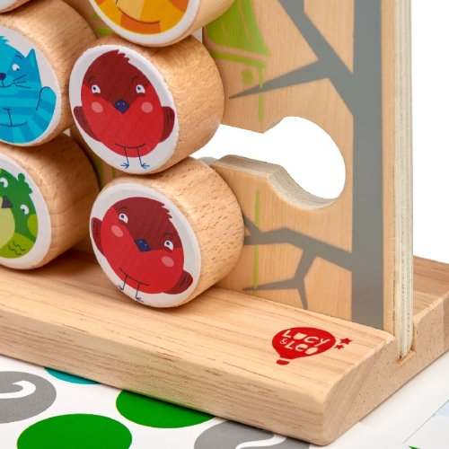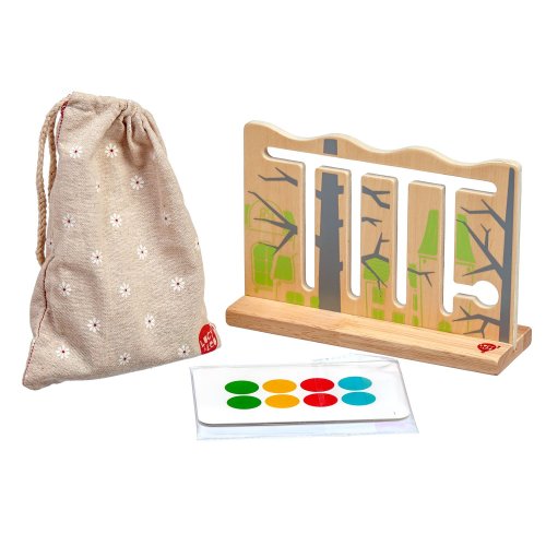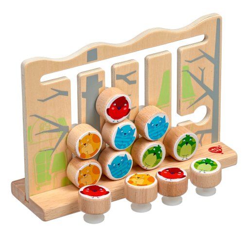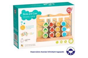 Drevená motorická hra vtáky a mačky s predlohami pomáha deťom rozvíjať logické myslenie, učiť sa farby a používať jemné motorické zručnosti. Hračka má drevenú dosku so štrbinami, kolíky na ktorých sú farebné zvieratká. Zahŕňa tiež 6 obojstranných kariet, na ktorých sú farebne vyobrazené usporiadanie kolíčkov. Cieľom hry je umiestniť vtáky a mačky do pozícií uvedených na kartách. Vtáky a mačky sa premiestňujú ťahaním a presúvaním v štrbinách po doske. Po skončení hry je možné kolíky umiestniť do ľanového vrecka. Rozmer hracej dosky dĺžka 22 cm, šírka 7 cm, výška 15 cm. Rozmery kolíkov 3x3 cm.