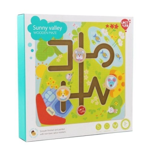 Slnečné údolie je drevený motorický labyrint, ktorý u detí rozvíja logické myslenie a podporuje jemnú motoriku. Drevená hracia doska je krásne maľovaná tematikou letného slnečného údolia s rybníkom. Má hladké drážky, v ktorých sa zvieratká pes, mačka a myška pohybujú tak, aby sa dostali, kam chcú. Psík do svojej búdy, mačička k rybníku loviť rybky a myška k svojej pochúťke. Cestou však musí starostlivo premýšľať, ako sa sebe navzájom vyhnúť, aby sa nezrazila. Preto zvieratká ustupujú pomocou zákutí, do ktorých sa môžu uchýliť. Rozmery hracej dosky: dĺžka 21cm, výška 21 cm, šírka 1,5 cm. Priemer cumlíka pohybujúceho sa v drážkach 3 cm.