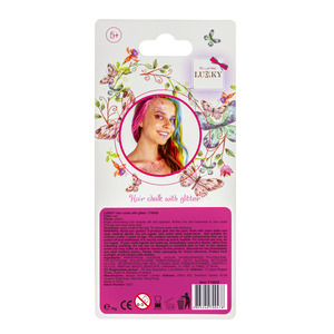 Krieda na vlasy Lukky s trblietkami. Krieda sa ľahko odstráni pomocou šampónu. Objem 10 g. Vhodné pre deti od 3 rokov.