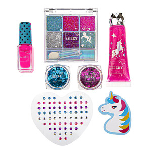 Súprava Beauty-Design “Jednorožec”. Obsah: 2× dóza s trblietavým gélom, 1× lesk na pery s príchuťou, 1× pilník na nechty, 1× zlupovací lak na nechty, 1× nálepky „drahokam“ na nechty a tvár, 1× trblietavé krémové očné tiene s aplikátorom. Pre deti od 3 rokov.