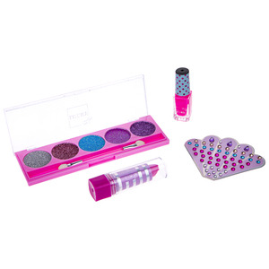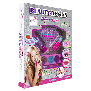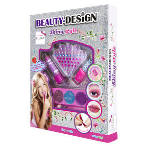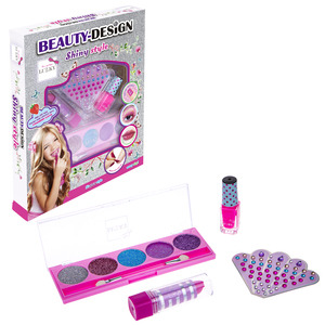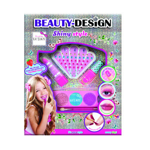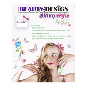 Súprava Beauty-Design “Blištivý štýl”. Obsah: 1× nálepky „drahokam“ na nechty, 1× rúž meniaci farbu, 1× trblietavé krémové očné tiene s aplikátorom, 1× zlupovací lak na nechty. Pre deti od 3 rokov.