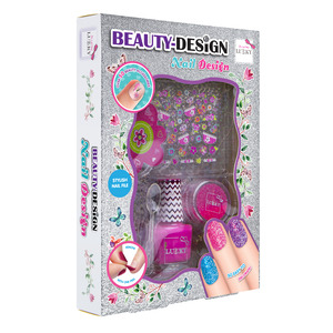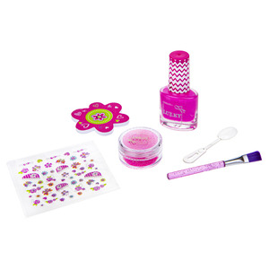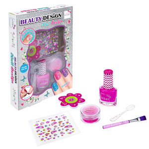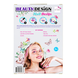 Sada Beauty-Design "Nechtové štúdio". Obsah: 1× štetec, 1× pilník na nechty, 1× samolepky na nechty, 1× šupovací lak, 1× dózička s trblietkami, 1× lyžička. Predeti od 3 rokov