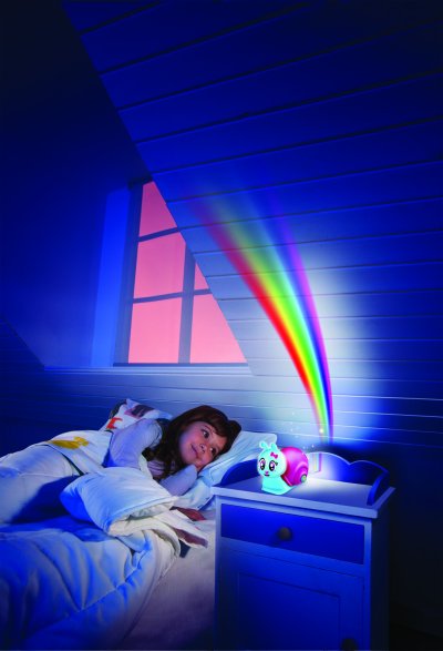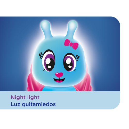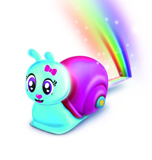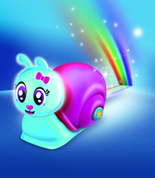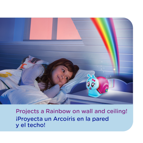 Slimák Lumiluvs po fúknutí na bruško a pusinku svieti. Stlač šnek tlačidlo na ulite a na stene a strope sa objaví dúha. Výrobok vyžaduje 3 × AAA batérie, ktoré sú súčasťou balenia. Vhodné pre deti od 18 mesiacov.