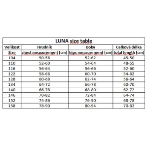 Aqua-Speed LUNA sú nádherné jednodielne športové plavky pre dievčatá. Aqua-Speed Luna ponúka moderný dizajn, podšívku na prednej strane a otvorený chrbát. Plavky sú vyrobené z mäkkých tkanín Malaga vysoko odolných voči chlóru a UV žiareniu. Juniorské športové plavky Aqua-Speed Luna budú skvele fungovať pri bežnom kúpaní aj pri plaveckom tréningu. Materiál: Malaga (80% Poliamid 20% Elastan) Vlastnosti tkaniny Malaga: Malaga je nepriehľadná látka, ktorá ponúka dokonalú rovnováhu medzi nízkou hmotnosťou a elasticitou. Vďaka použitiu technológie Lycra Extra Life má Malaga vysokú odolnosť voči chlóru a oteru . Vďaka ochrane proti UV žiareniu je Malaga ideálna na výrobu plážového oblečenia a spĺňa najvyššie špecifikácie pre odvetvie športového oblečenia. Veľkostná tabuľka v obrázkoch ch. Uvedené hodnoty sú iba orientačné a vhodná veľkosť sa môže líšiť podľa konkrétneho typu postavy.