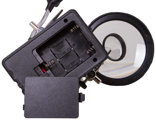 Na výber máte jednu pevnú šošovku (2,5 x) a dve výmenné šošovky s priblížením 7,5 xa 10 x. Pevná lupa má priemer 90 mm a vedľajšiu 34 mm. Tie môžete nacvaknúť do nastaviteľného držiaka v spodnej časti pevnej lupy. Osvetlenie pracuje s piatimi LED, ktoré sú napájané adaptérom AC, alebo tromi AA batériami (nie sú v balení).