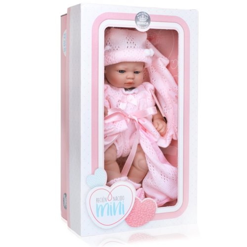 Luxusná španielska detská bábika-bábätko Berbesa Valentina. Bábika má vinylové telíčko, ručičky aj nožičky. Valentina má milú tváričku, ktorá vyzerá ako ozajstné bábätko. Faldíky na ručičkách, nožičkách a brušku ešte viac pripomínajú novorodenca. Bábika má krásne modré kukadlá, ružové pierky, ručičky a nožičky sú pohyblivé v kĺboch. Súčasťou je roztomilý pletený ružový overal s mašličkou, pletená čiapočka, ponožky a krásna pletená zavinovačka. Obleček sa dá zložiť. Telíčko bábätka má jemnú vôňu po vanilke. Dĺžka bábiky je cca 28 cm. Vhodné pre deti od 3 rokov. Pri výrobe sú používané výhradne kvalitné materiály.