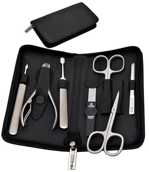 Luxusná manikúrová sada v čiernom koženom puzdre so zapínaním na zips. Pfeilring Solingen je výrobca špičkového náradia na manikúru a pedikúru, pochádza zo Solingenu a má viac ako 100-ročnú tradíciu. Jedná sa o najprestížnejšieho výrobcu v danom odbore, ktorého nástroje prechádzajú prísnymi výstupnými kontrolami. Nástroje sú vhodné na profesionálne aj domáce použitie. Vyrobené z nerezovej ocele.