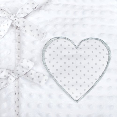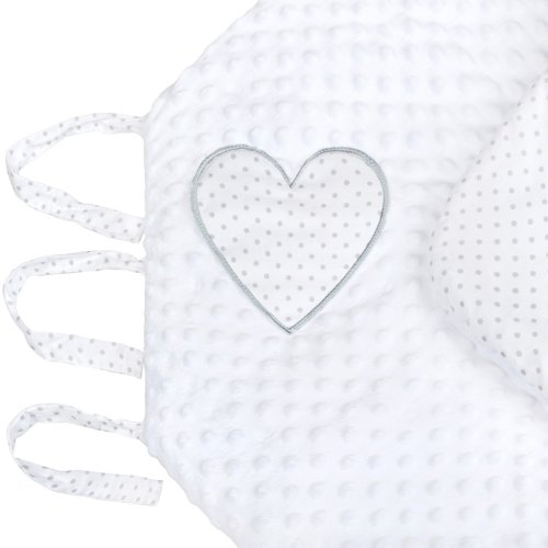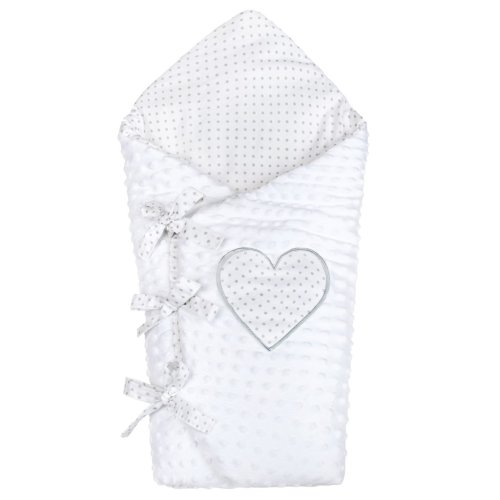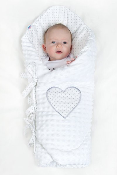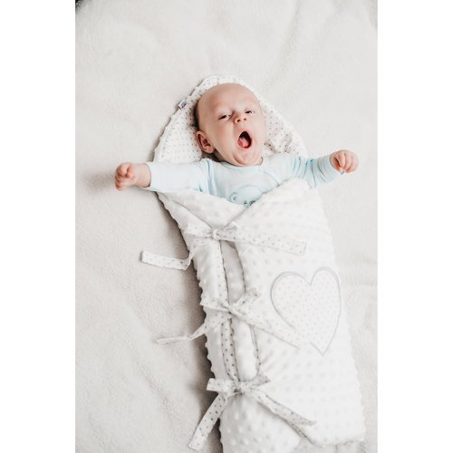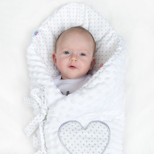 Luxusné šnurovacie zavinovačka z Minky New Baby. Zavinovačka je vyrobená z dvoch typov tkanín a je zdobená krásnym vyšívaným srdiečkom a šedým bodkovaným bavlneným podkladom. Prvá je veľmi mäkká a na dotyk príjemná, hebká Minky látka s výstupkami pre stimuláciu senzomotoriky a druhou je 100% bavlna. Zavinovačka sa zaväzuje na tri rady stúh, ktoré Vaše bábätko pevne záviny.