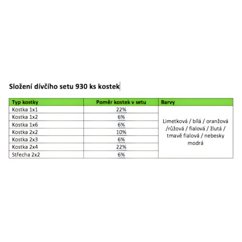 Sada základných stavebných kociek v pestrých dievčenských farbách, ktoré prebúdza fantáziu k stavbe neobyčajných sídiel, zámkov, domčekov a izieb. Balené v priehľadnom plastovom sáčku. Hlavné vlastnosti: 7 druhov kociek, 8 fariebkompatibilný s ďalšími stavebnicami Certifikát „Bezpečné hračky“ je vydávaný Inštitútom pre testovanie a certifikáciu, a. s . (ITC), nezávislou spoločnosťou s medzinárodnou pôsobnosťou, ktorá poskytuje odborné služby v oblasti skúšania a certifikácie hračiek viac ako 15 rokov. Označuje výrobky skutočne starostlivo posúdené z hľadiska všetkých možných rizík. Jeho vydanie je podmienené pravidlenými kontrolami dodávateľov, procesu výroby a skúškami výrobkov, ktoré zaručujú istotu trvalého súladu s požiadavkami na bezpečnosť a kvalitu.