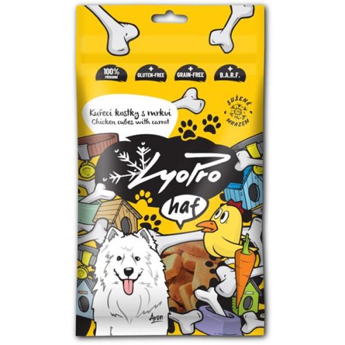 Mrazom sušené kuracie kocky patria medzi vyhlásené psie pochúťky. Doprajte svojmu vernému priateľovi gurmánsky zážitok, na ktorý len tak nezabudne. Intenzívnu chuť kuracieho mäska dopĺňajú svieže tóny šťavnatej mrkvy, ktorá dodá maškrtu porciu vlákniny, karoténu a vitamínov.