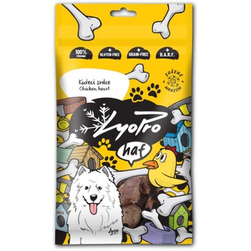 Mrazom sušené vnútornosti neobsahujú žiadne konzervanty, farbivá ani iné balastné látky. Vyrába sa iba z jedinej suroviny – kuracích srdiečok, ktoré vášmu maznáčikovi dodajú veľa vitamínov a minerálov. Sušenie pri veľmi nízkych teplotách zaručuje uchovanie veľkého množstva výživných látok, ktoré sú dôležité pre dobrú kondíciu aj pevné zdravie vášho psa. Maškrta je vhodná aj pre miláčikov so špeciálnou diétou alebo alergiami.