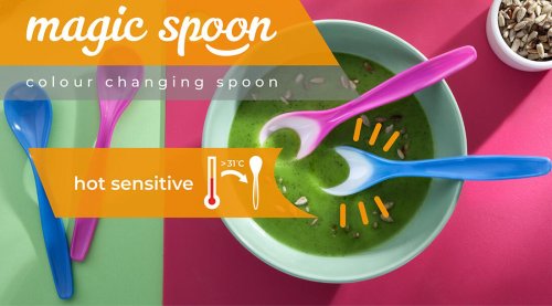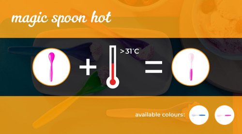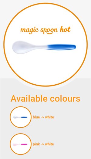Plastová lyžička, meniaca farbu, keď je vystavená teplu. Reaguje na teploty nad 31 °C. Lyžičky sú bezpečné bez BPA, PAH a ftalátov.